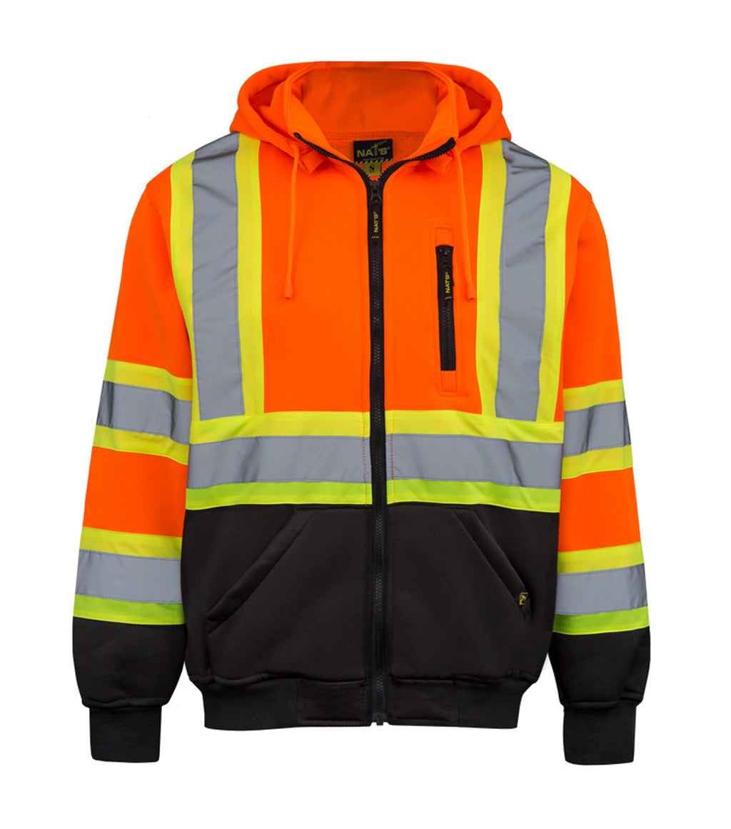 High visibility hoodie with reflective stripes. Brushed inside finish. Reflective stripes and fabric respecting the standards of CSA Z96-15, Class 2, Level 2. YKK front zipper. Chest pocket with zipper. Removable hood. 100% polyester 280g.