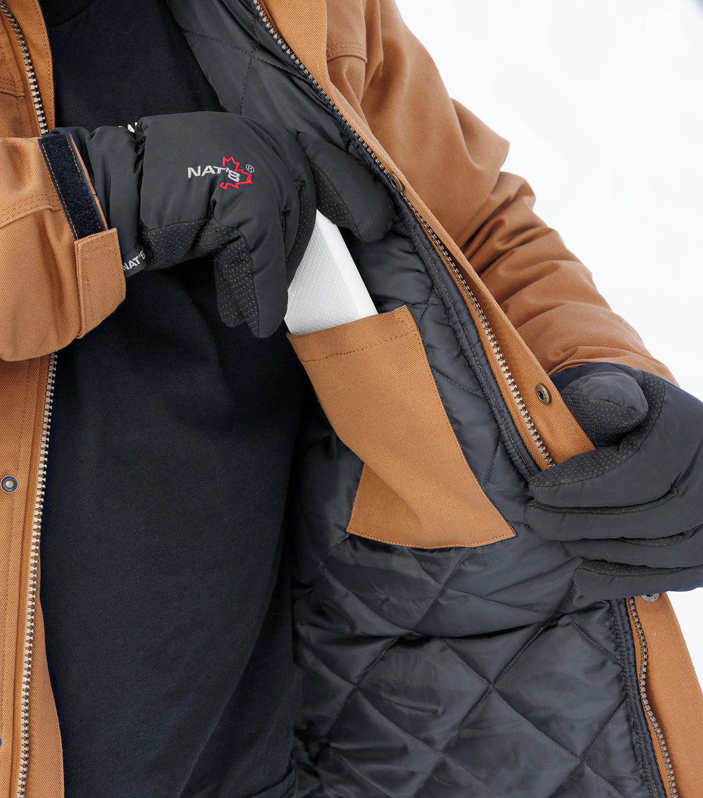 Our new insulated work parka made of cotton duck, designed to withstand the harshest conditions. It features a detachable, lined, and adjustable hood for optimal comfort. Thanks to its water-repellent treatment, this jacket effectively repels water and dirt, providing you with warmth and protection throughout your workday