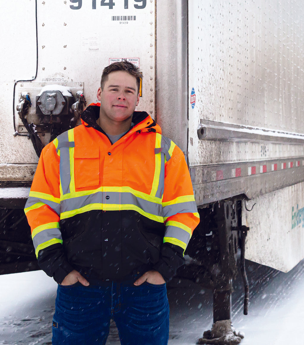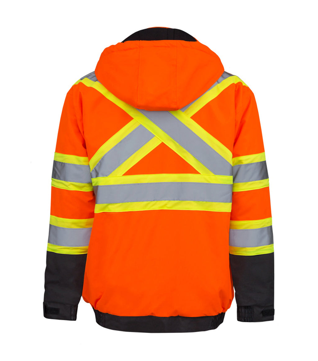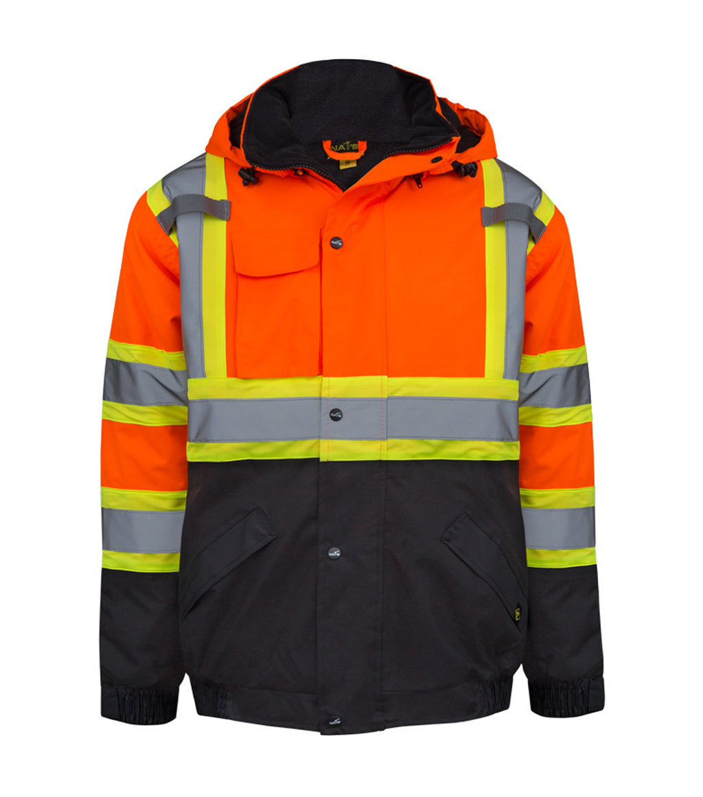 Manteau haute visibilité imperméable avec bandes réfléchissantes. Bandes réfléchissantes respectant les normes de la CSA Z96-15, Classe 2, niveau 2. Poche poitrine. Coutures scellées. Doublure douce et confortable en micropolaire. Fermoir avant YKK. Capuchon amovible. Poche poitrine. Ganse utilitaire à la poitrine. 100% polyester, 300D oxford avec enduit P.U.