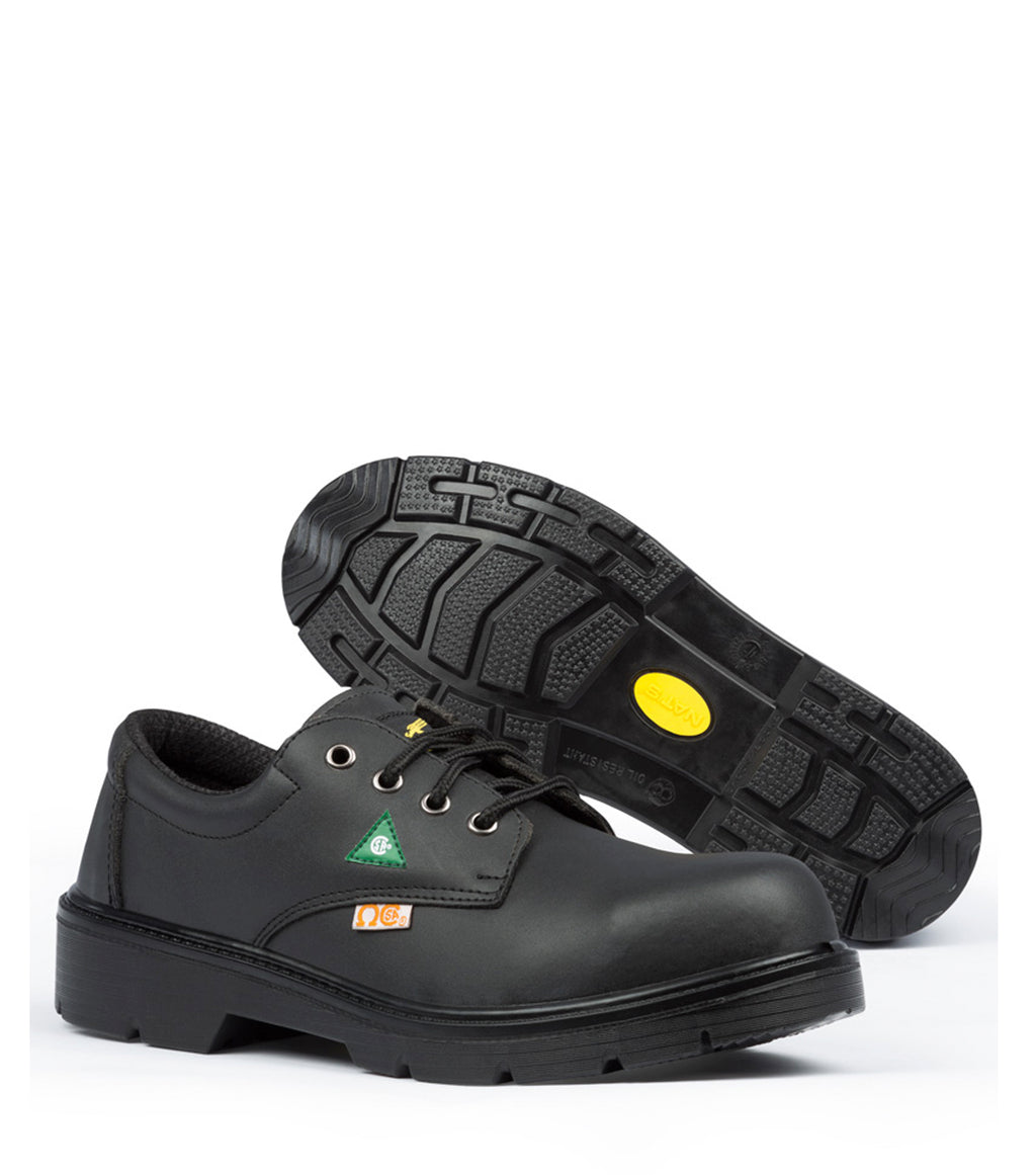 Soulier de sécurité lacé à 4 œillets. Doublure rembourrée. Cuir laminé. Semelle résistante aux huiles. Embout et semelle en acier. Approuvé CSA classe 1 et diélectrique.